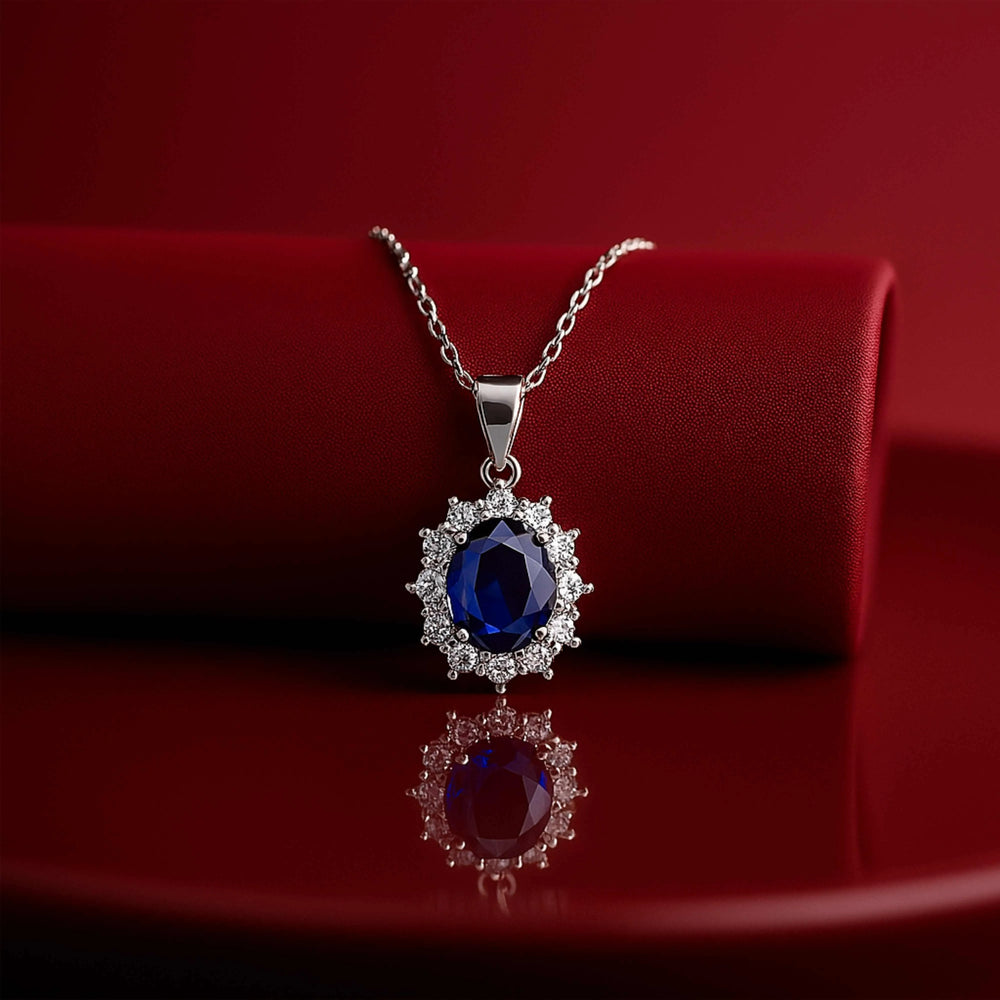 925 Sterling Silver Blue Sapphire Pendant Necklace | Rhodium Plated with Cubic Zirconia Halo