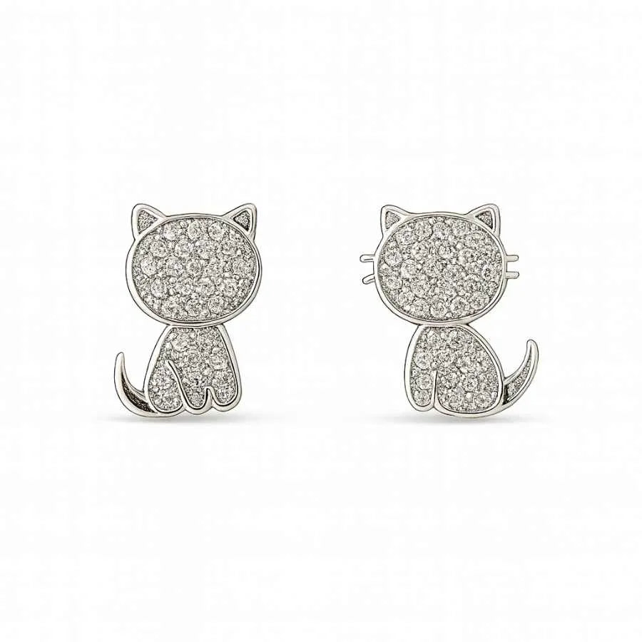 925 Sterling Silver Cat Stud Earrings | Rhodium Plated Kitty Design with Cubic Zirconia