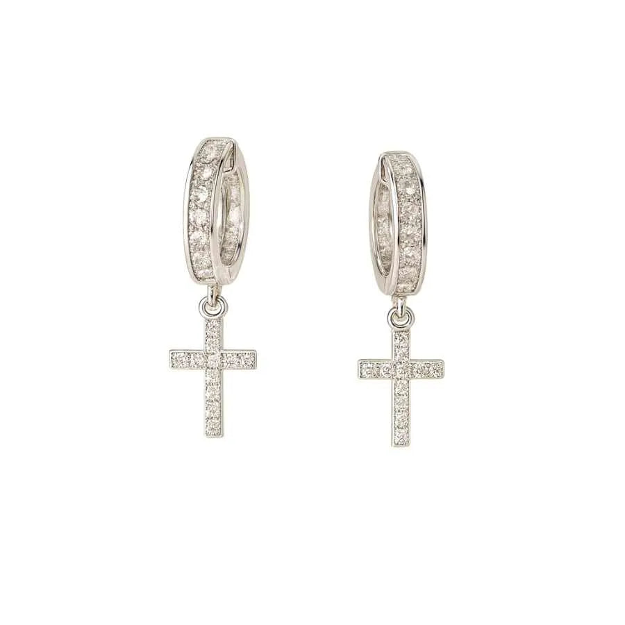 925 Sterling Silver Cross Hoop Earrings | Rhodium Plated Cubic Zirconia Dangle Huggies