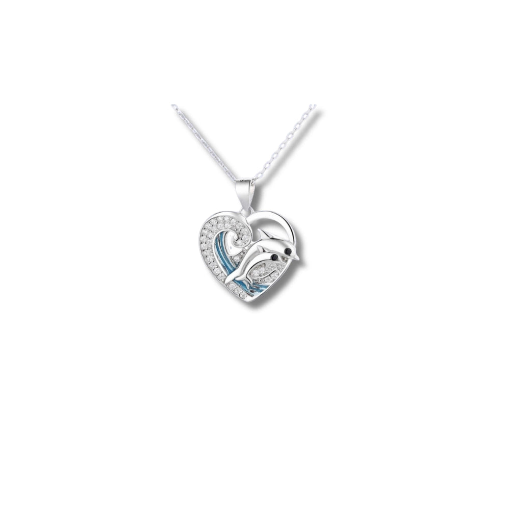 925 Sterling Silver Dolphin Heart Necklace | Rhodium Plated with Blue Enamel & Cubic Zirconia