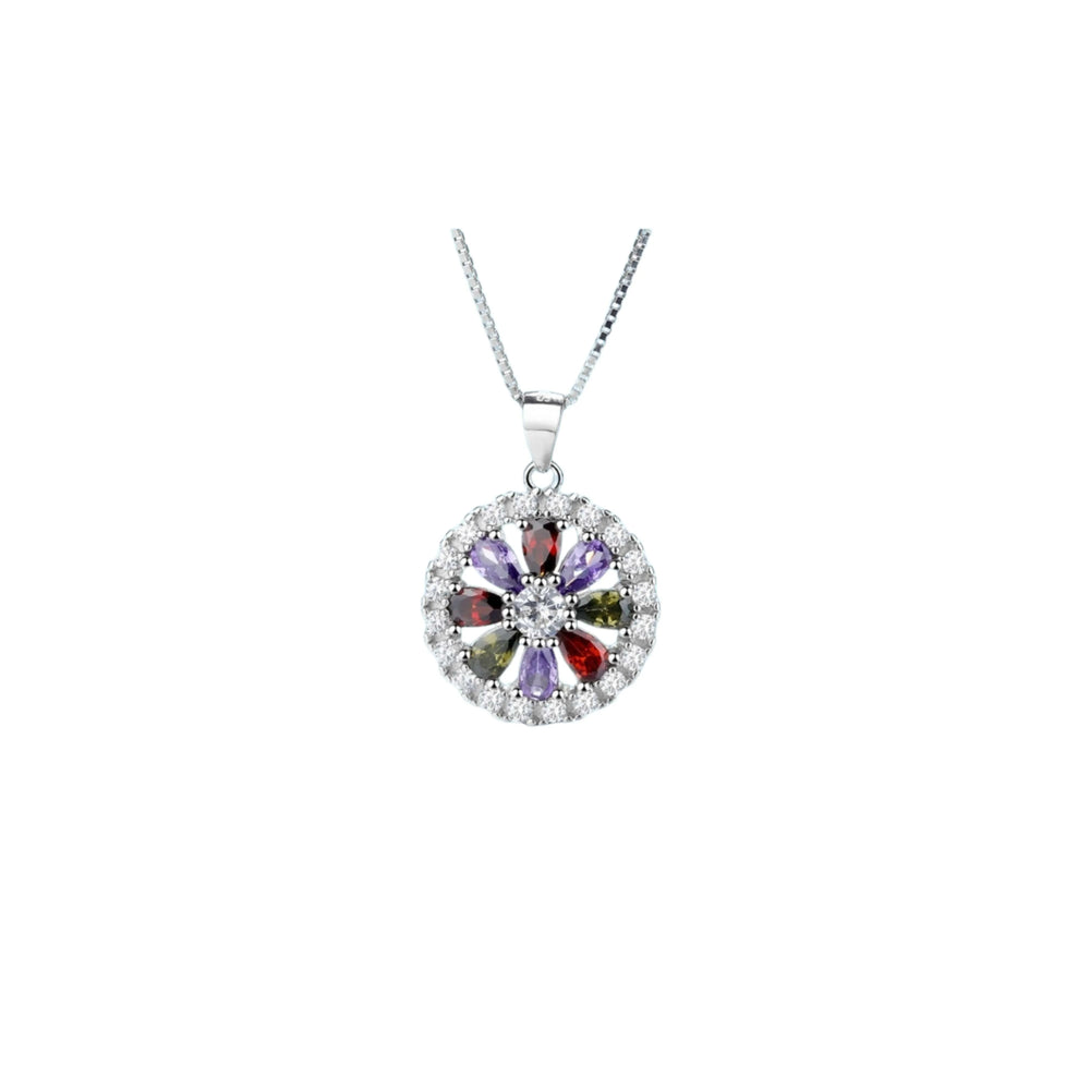 925 Sterling Silver Flower Pendant Necklace | Rhodium Plated with Multicolor Cubic Zirconia Stones