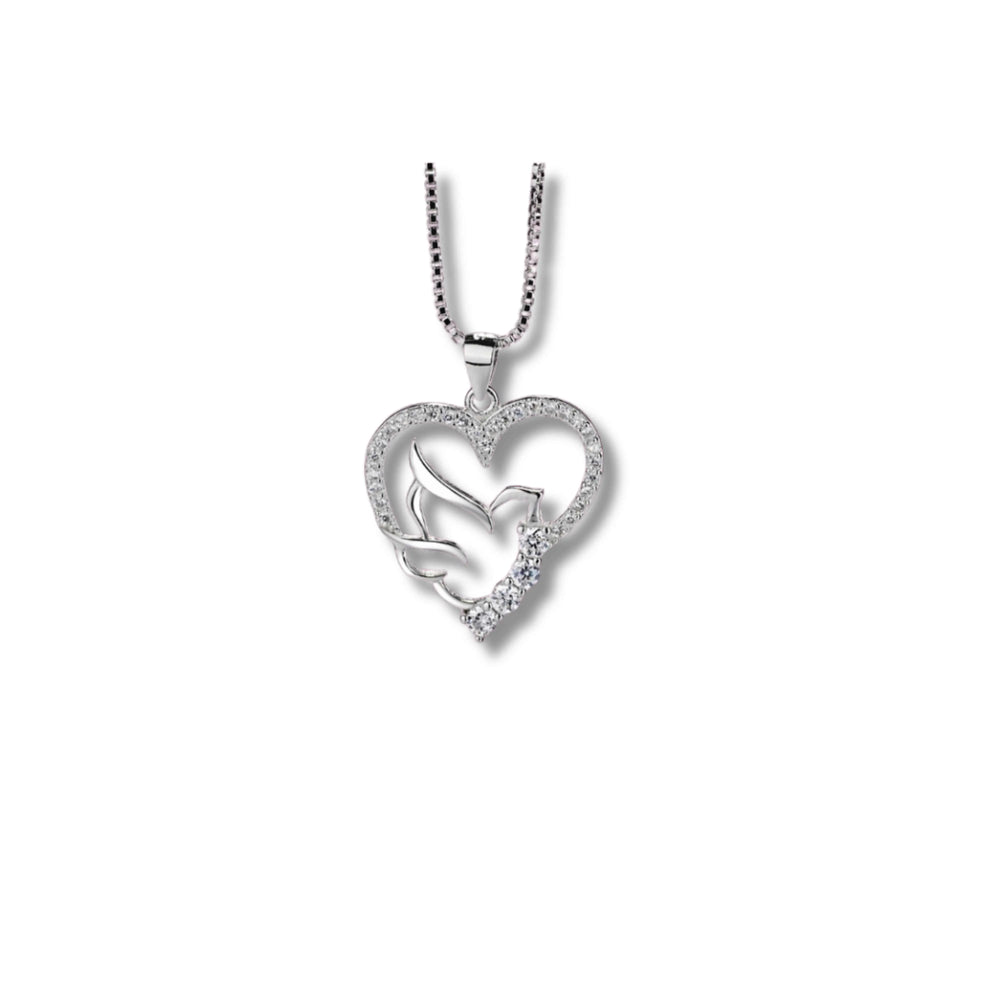 925 Sterling Silver Heart Dove Pendant Necklace | Rhodium Plated with Cubic Zirconia Stones
