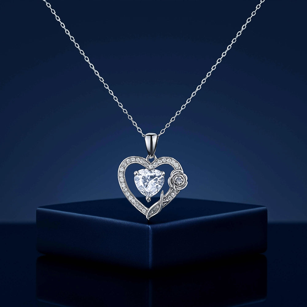 925 Sterling Silver Heart & Rose Pendant Necklace | Rhodium Plated with Cubic Zirconia – Romantic Gift Jewelry