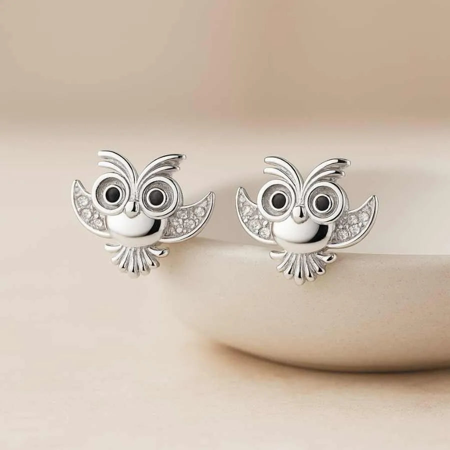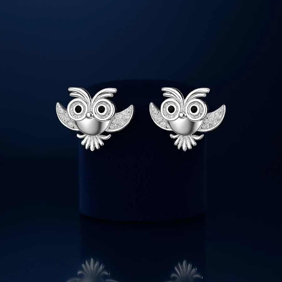 925 Sterling Silver Owl Stud Earrings | Rhodium Plated with Cubic Zirconia Accents for Women & Girls