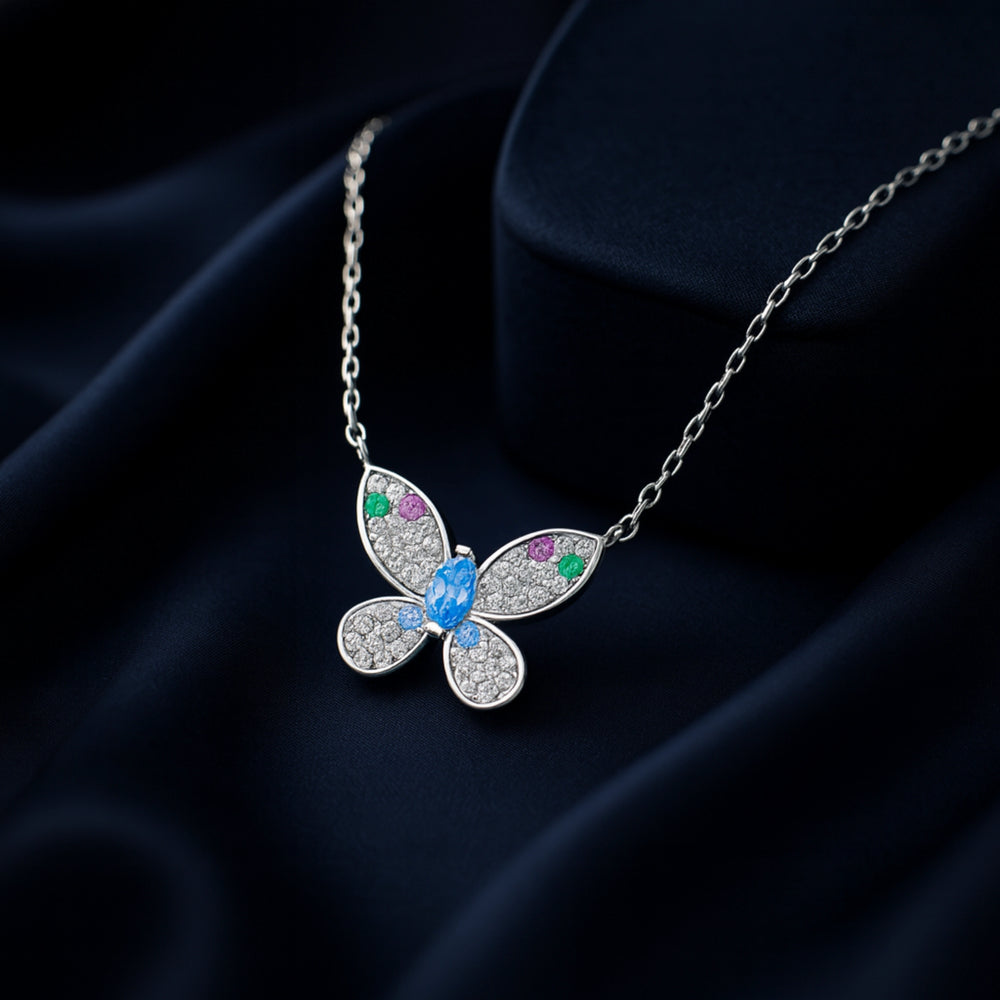925 Sterling Silver Rhodium Plated CZ Multicolor Butterfly Pendant Necklace