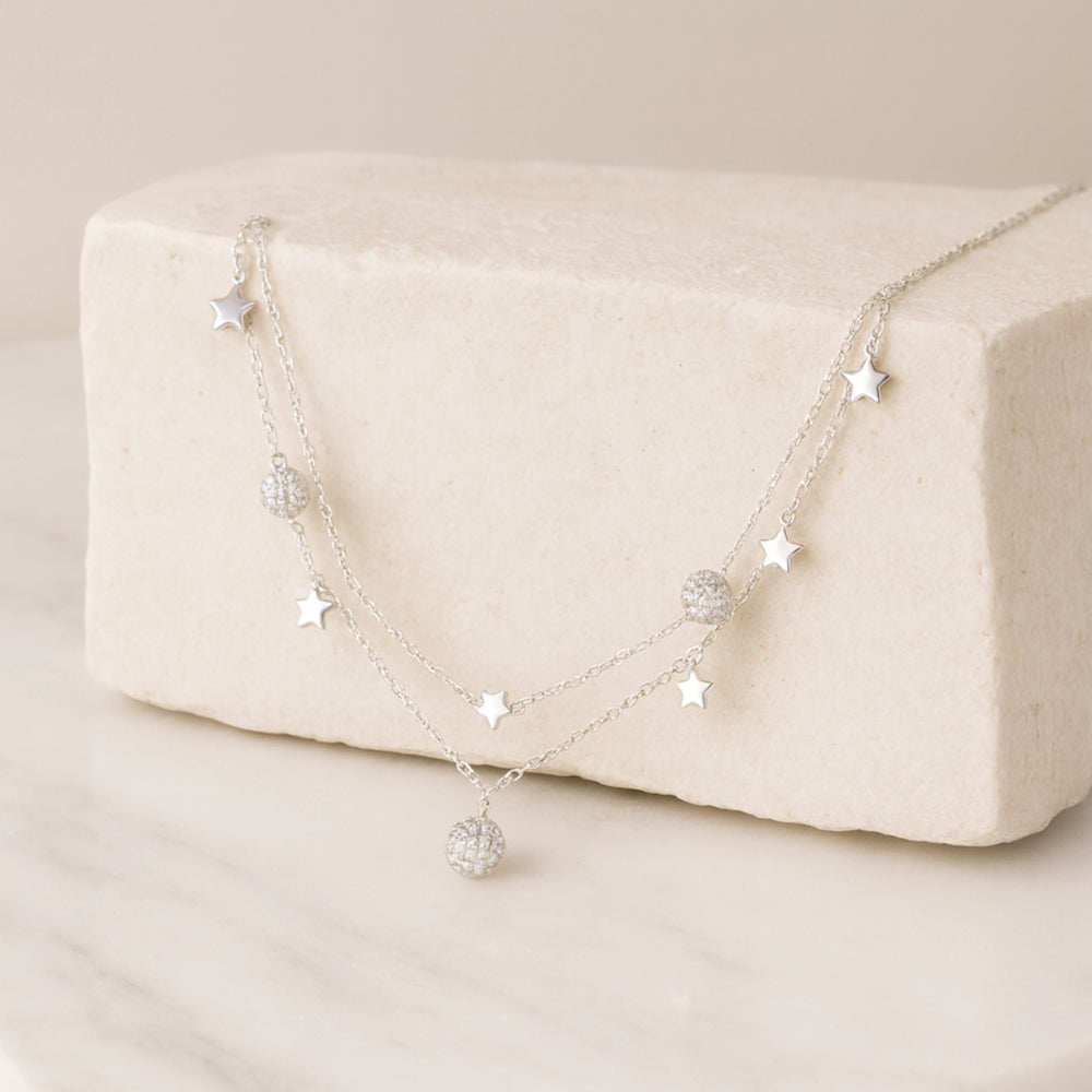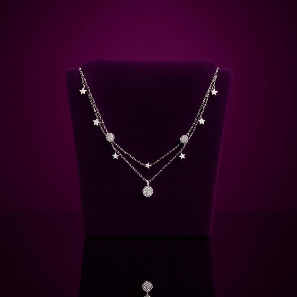 925 Sterling Silver Rhodium Plated CZ Star Layered Pendant Necklace