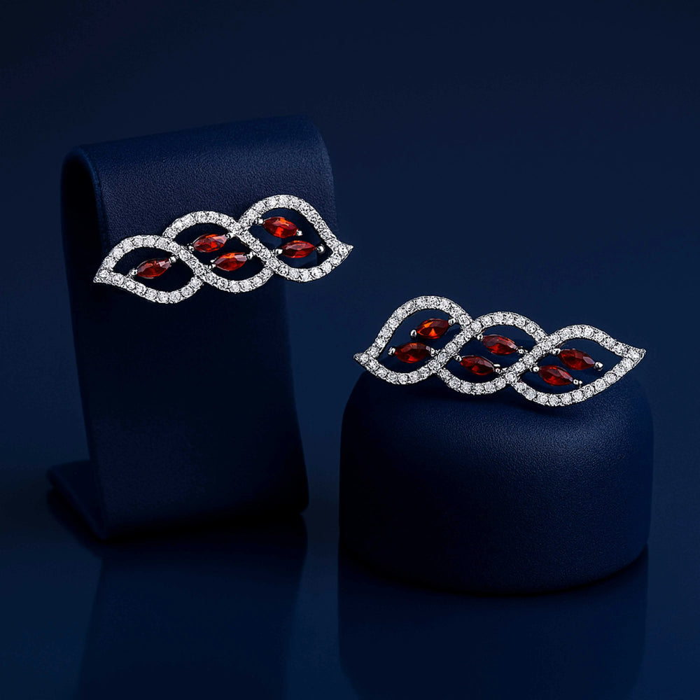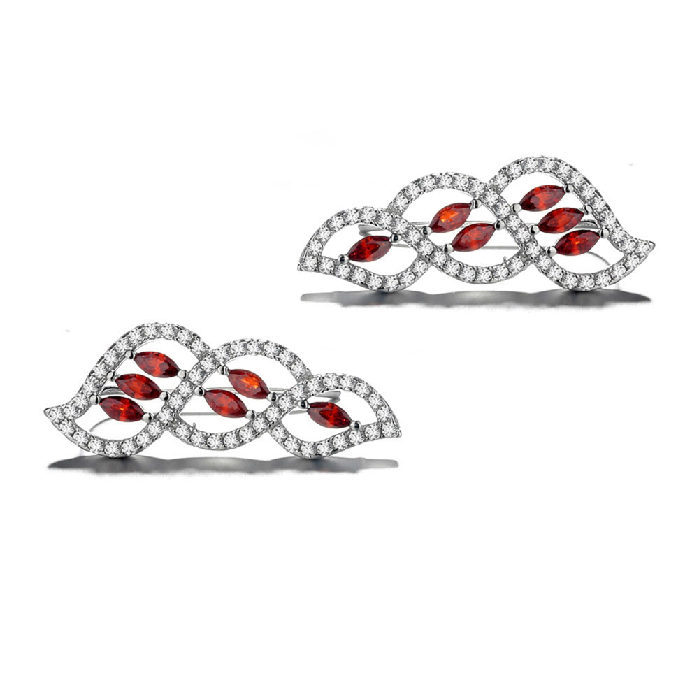 925 Sterling Silver Rhodium Plated Red Garnet Leaf Ear Cuffs with Cubic Zirconia