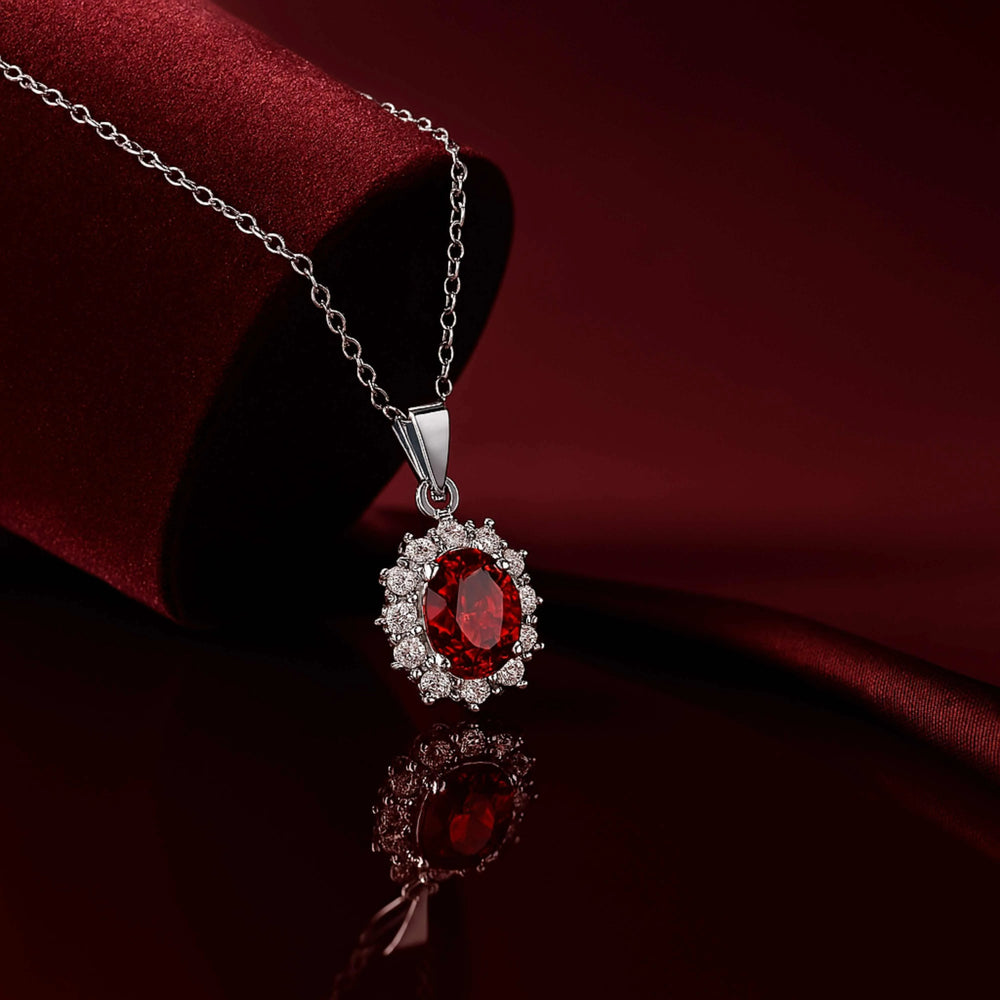 925 Sterling Silver Ruby Red Pendant Necklace | Rhodium Plated with Cubic Zirconia Halo