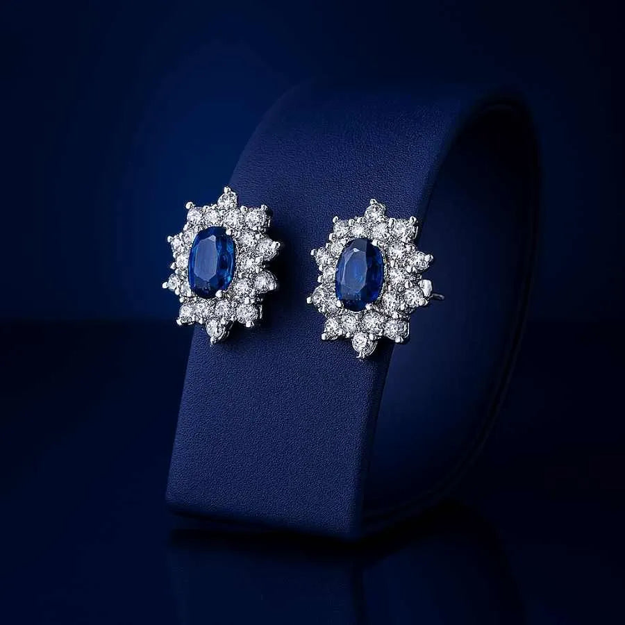 925 Sterling Silver Sapphire Stud Earrings | Rhodium Plated Earrings with Cubic Zirconia Halo