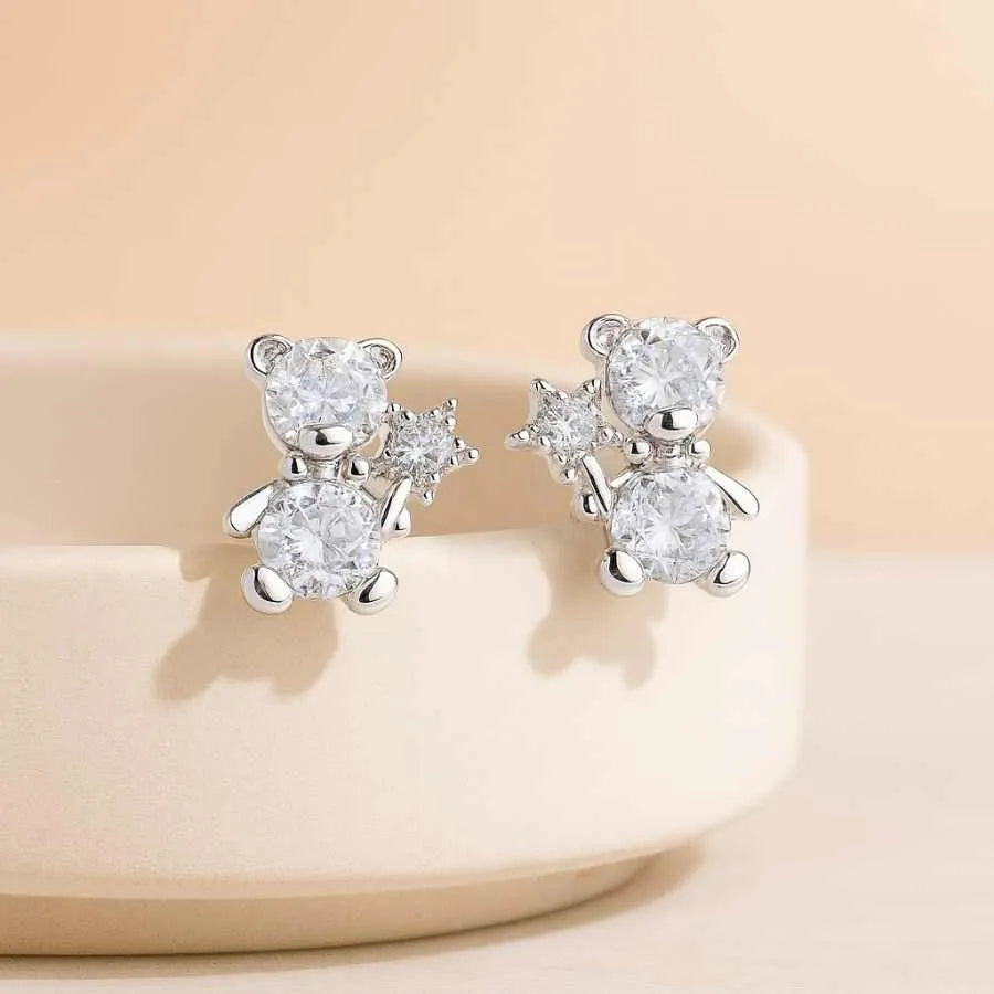 925 Sterling Silver Teddy Bear Earrings with Cubic Zirconia | Rhodium Plated Cute Studs